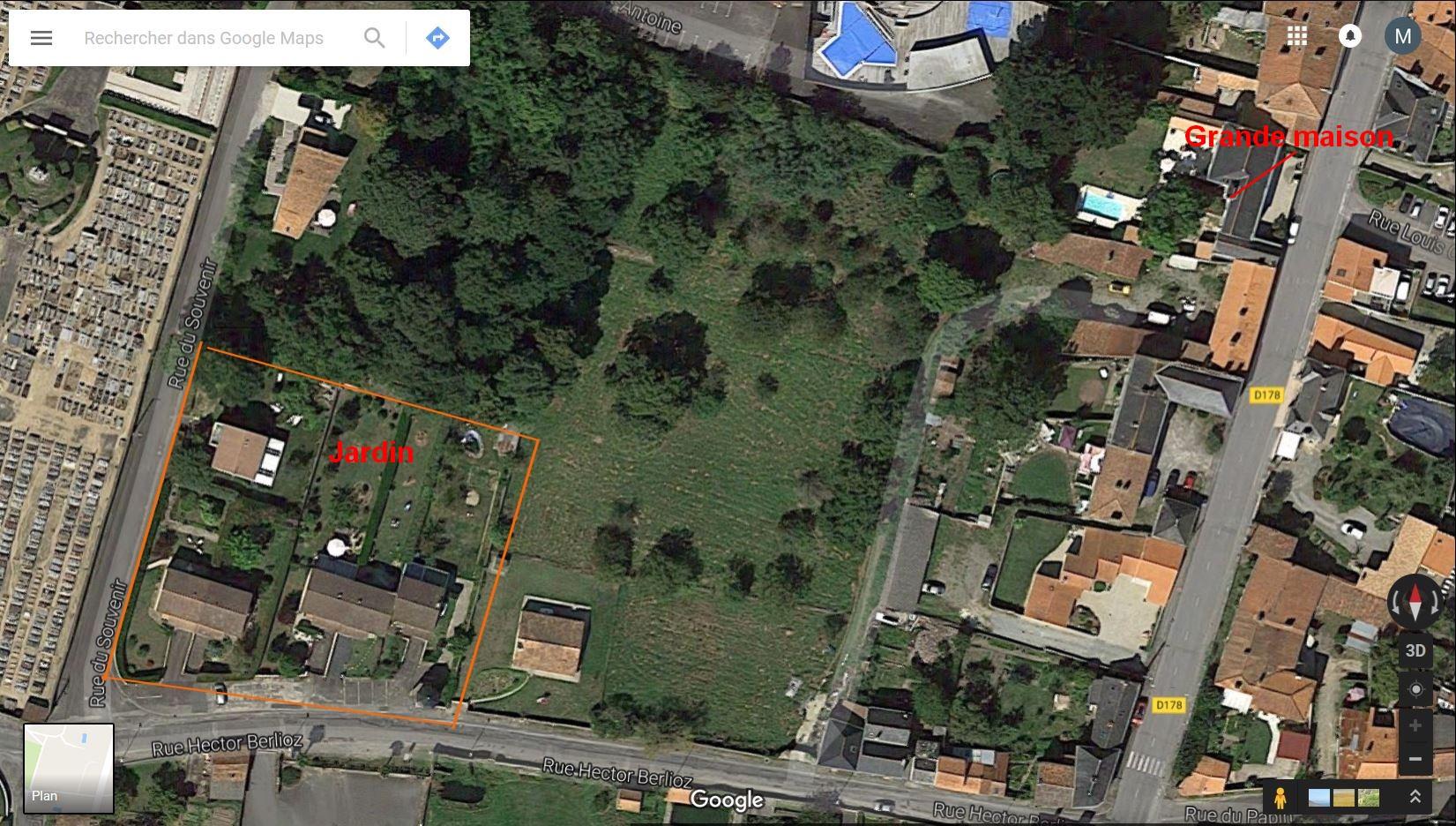 Justement, aujourd'hui on va visiter le jardin d'Elie. Comme le montre les cartes, à vol d'oiseau il n'était pas très loin de la fameuse Grande Maison. J'ai retrouvé ces deux cartes qui montrent la grandeur de ce jardin qui au fil du temps s'est transformé en lotissement.